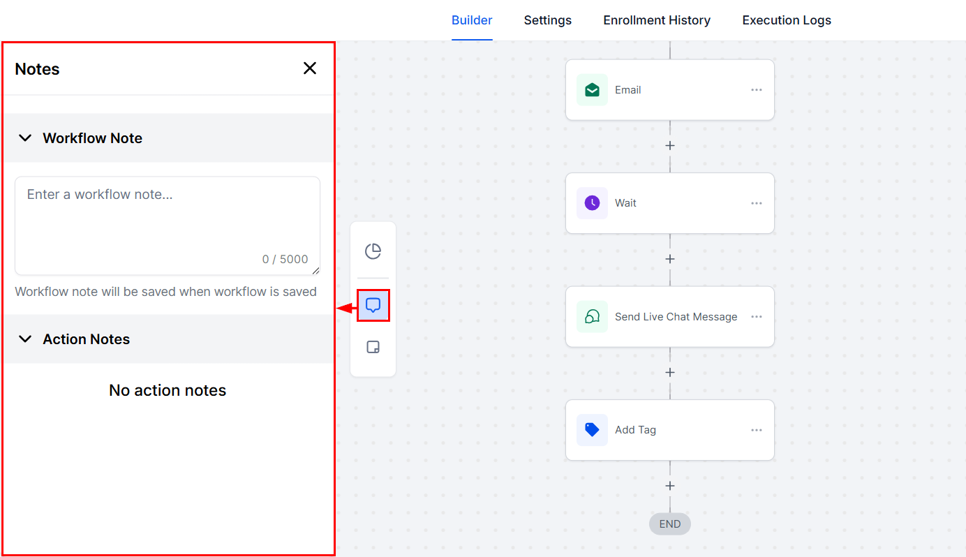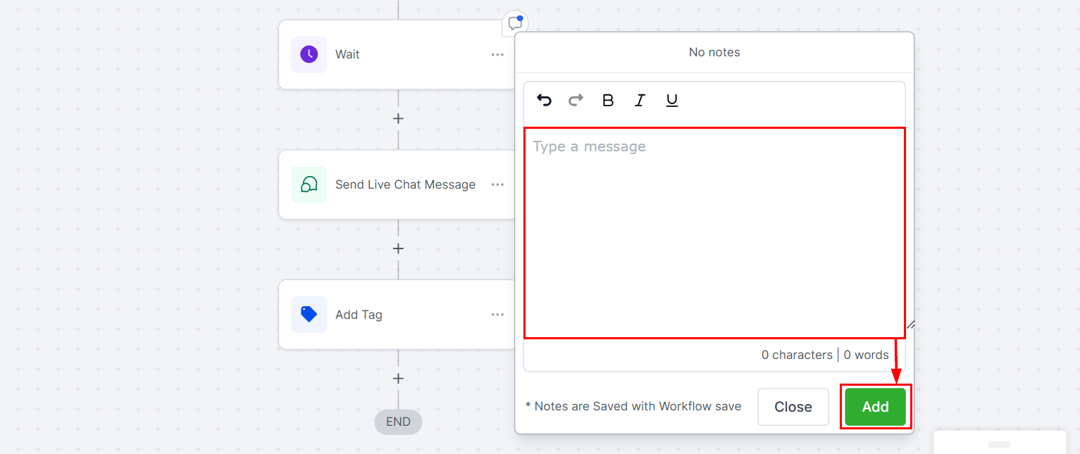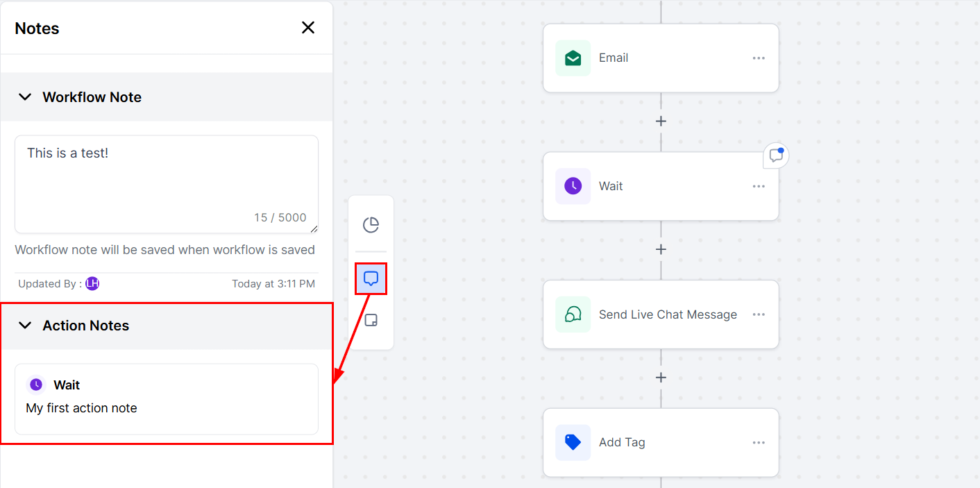 To add a note to your workflow, click the Notes icon and enter the desired text in the Workflow Notes section bearing the 5000-character limit in mind. Once you have completed your entry, confirm the text and save the workflow to retain the note.