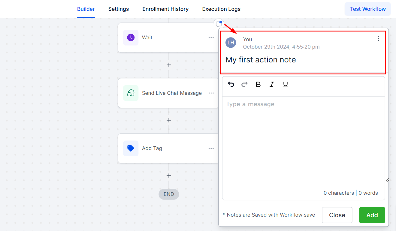 Each note retains a history of additions, enabling teams to effortlessly track discussions, updates, and feedback related to specific actions within a workflow.