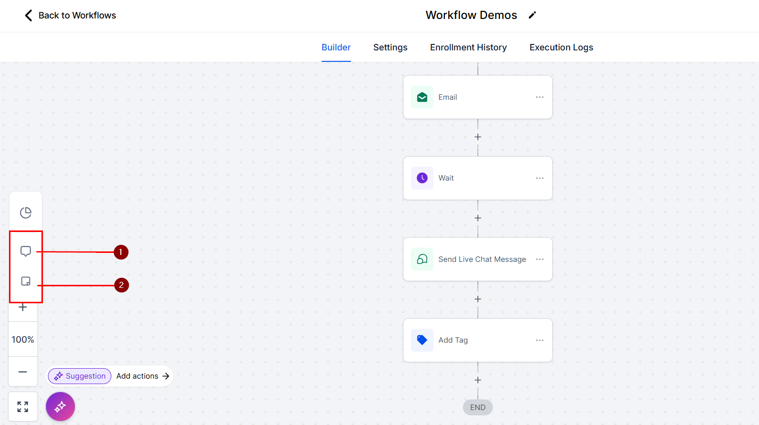 On the left sidebar, you will find both the notes icon (1) and the sticky notes icon (2). Workflow Notes are stored discreetly within the Notes tab, while Sticky Notes are prominently visible within the builder for easy reference. Select the option that best aligns with your requirements.