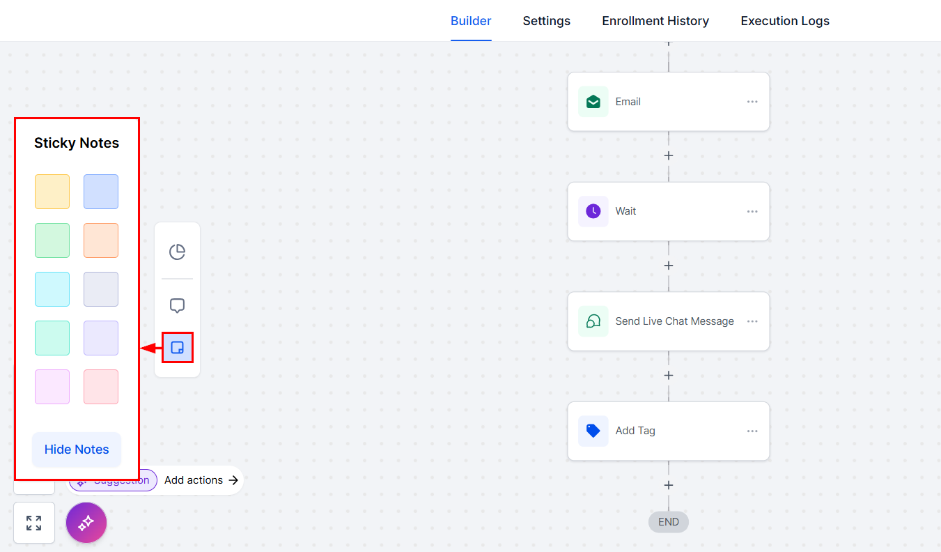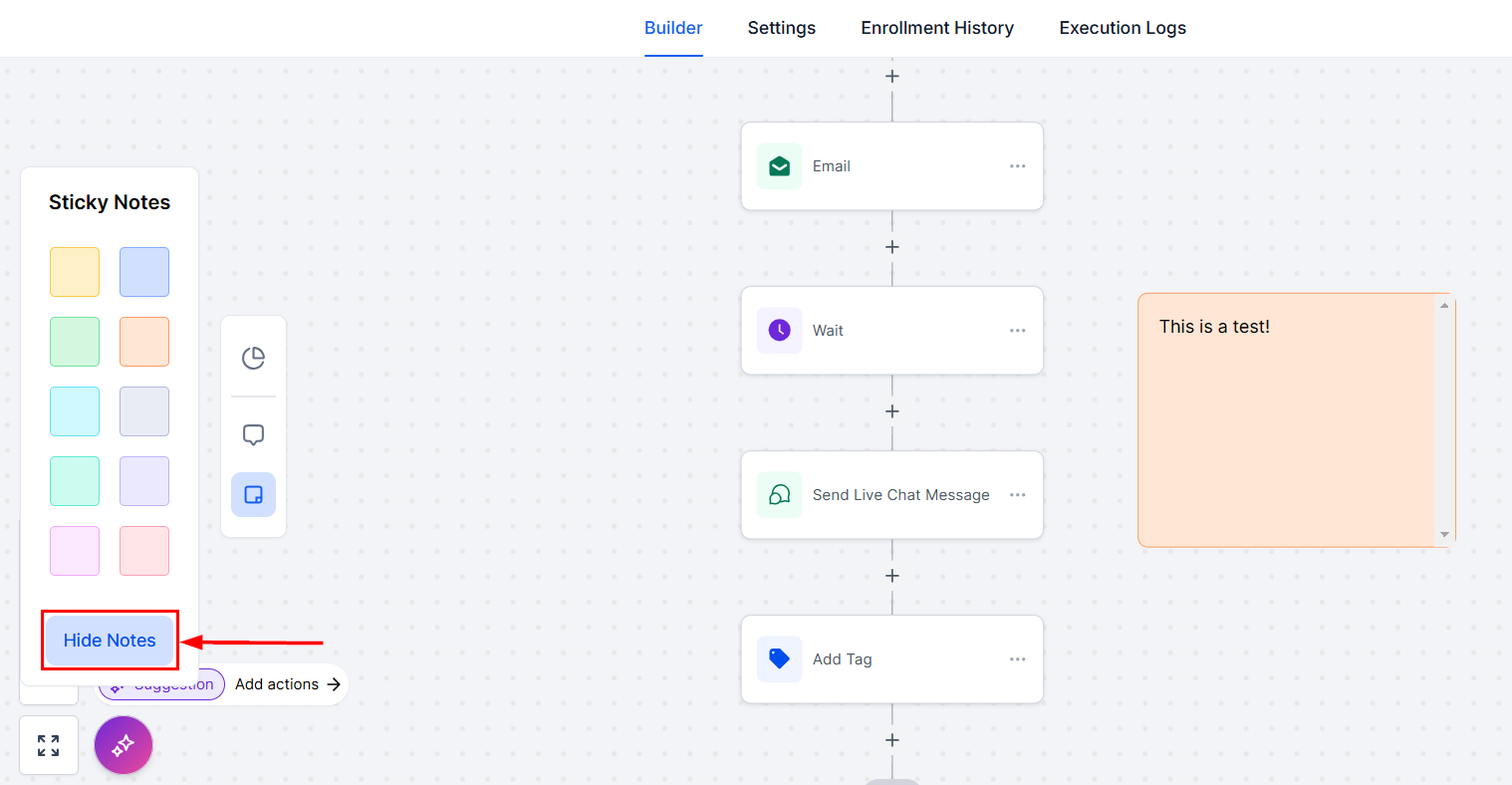 To clear your view of all Sticky Notes, simply click the "Hide Notes" button. This action temporarily conceals all Sticky Notes within the builder, allowing you to focus on other workflow elements without distraction. To make the notes visible again, click the "Show Notes" button.