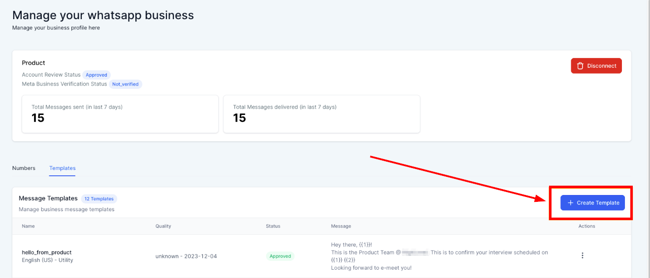 Navigate to Settings > WhatsApp > Templates and click on Create Template.