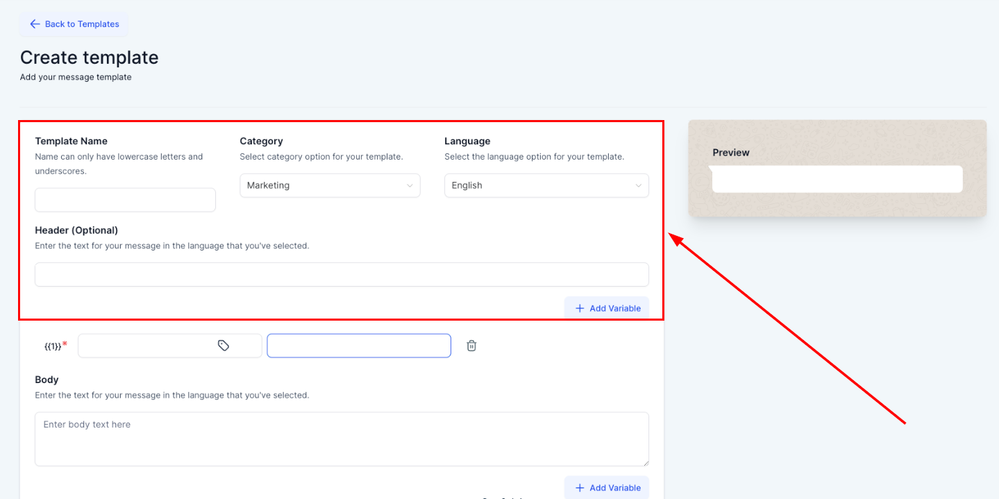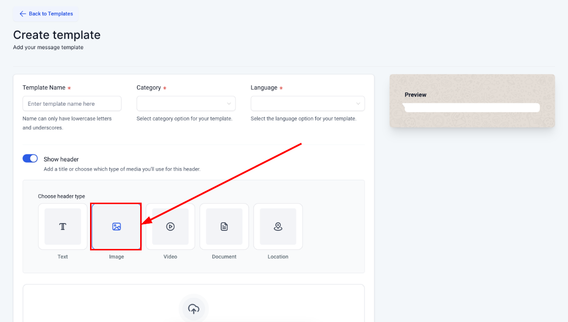 A new section will appear where you need to provide the Template Name, Category, Language, and Header information.