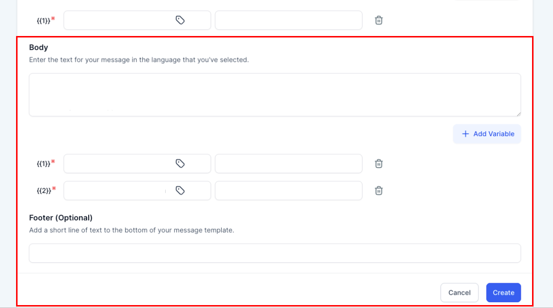 - In the Body, compose the message to be sent to the customer, including multiple custom variables if necessary. The Footer is optional and can be static.