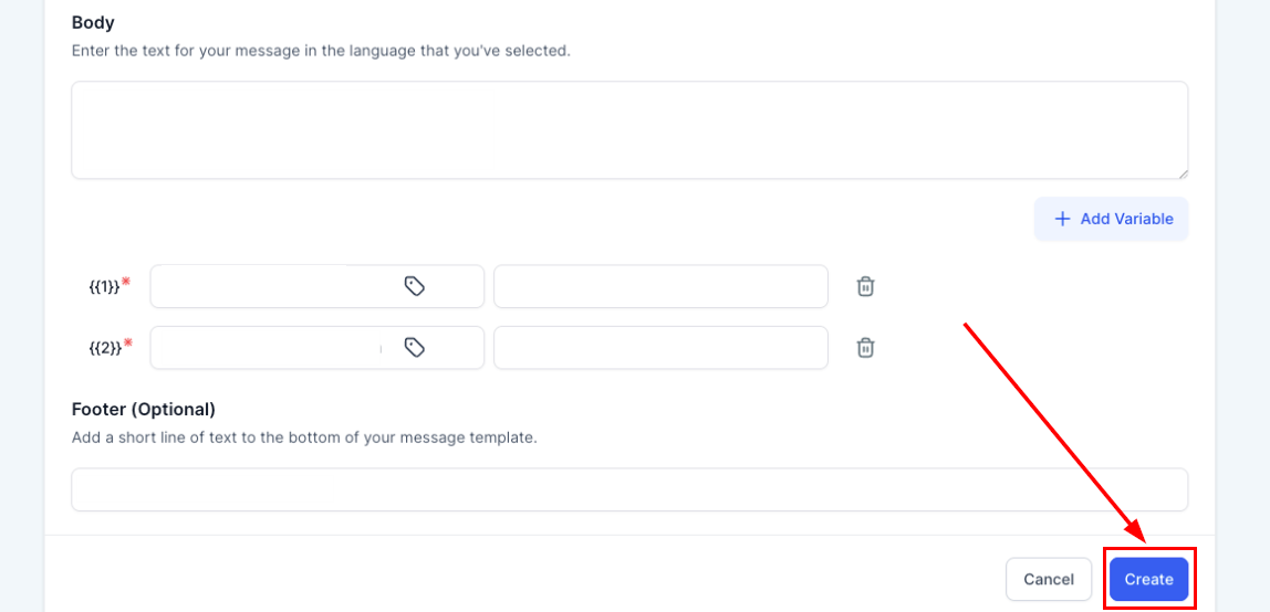 - Body: Compose the message to be sent to the customer, including multiple custom variables if necessary by clicking on Add Variable.