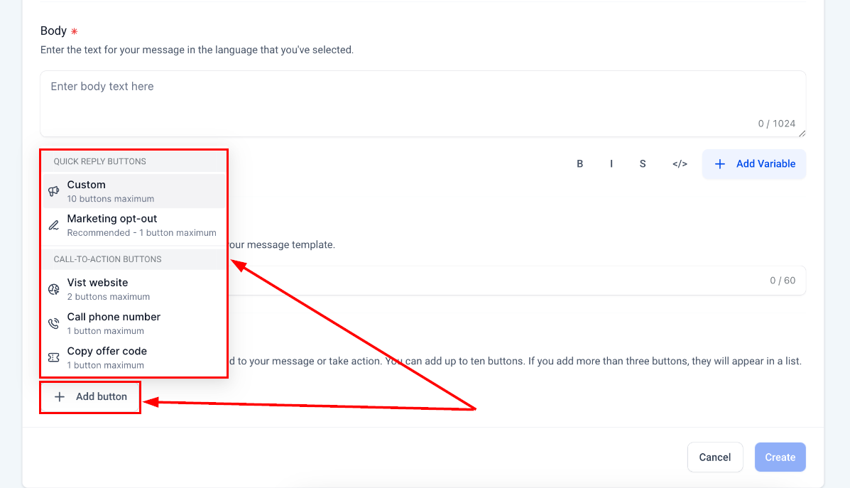 When creating a new template, select from a variety of CTA buttons such as Quick Reply, Visit Website, Personalized Website Link, Call Phone Number, Copy Offer Code, or Marketing Opt-Out.