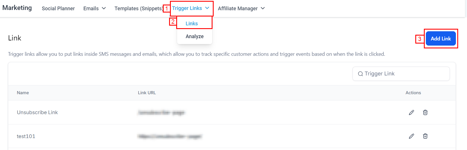 Navigate to Marketing > Trigger Links > Add Link.