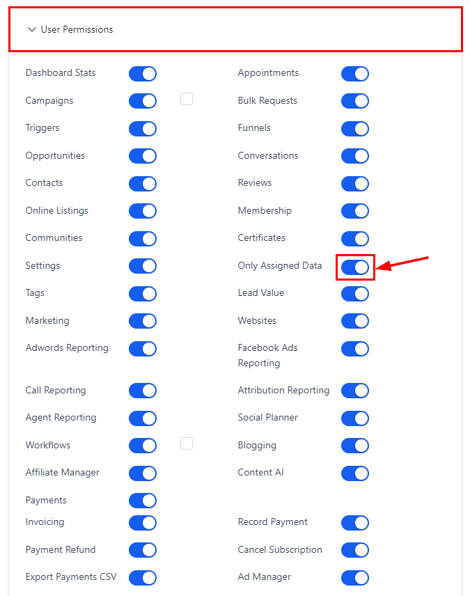In user permissions, turn on the toggle for “Only Assigned Data” to enable the feature. It should be highlighted as displayed below.