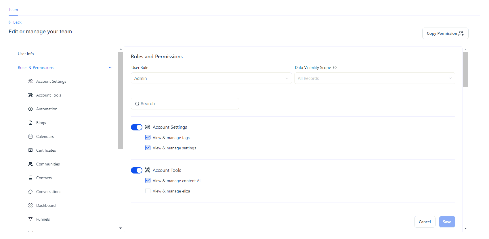 In certain cases, it is necessary to first navigate to the Roles & Permissions section and update the user's role to "User" before adjusting the Data Visibility Scope.