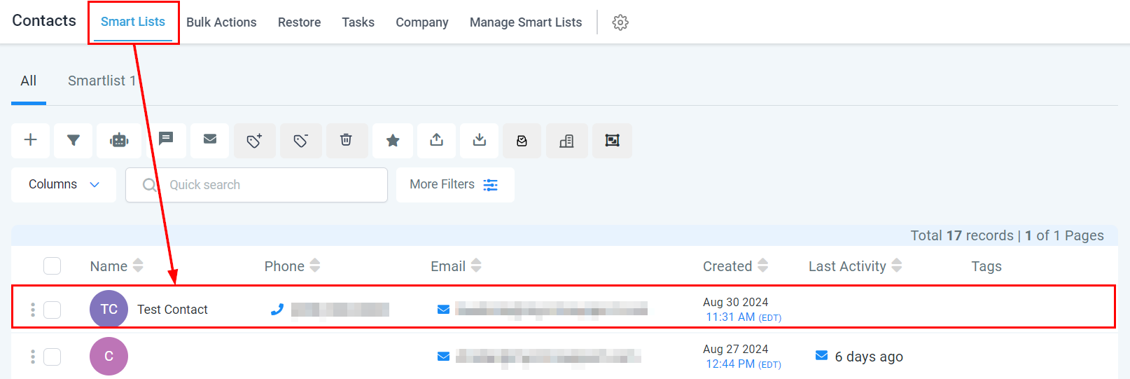 Return to the main menu, then access the "Contacts" tab from the left sidebar and navigate to "Smart Lists." Once there, click on the desired contact to open its details.