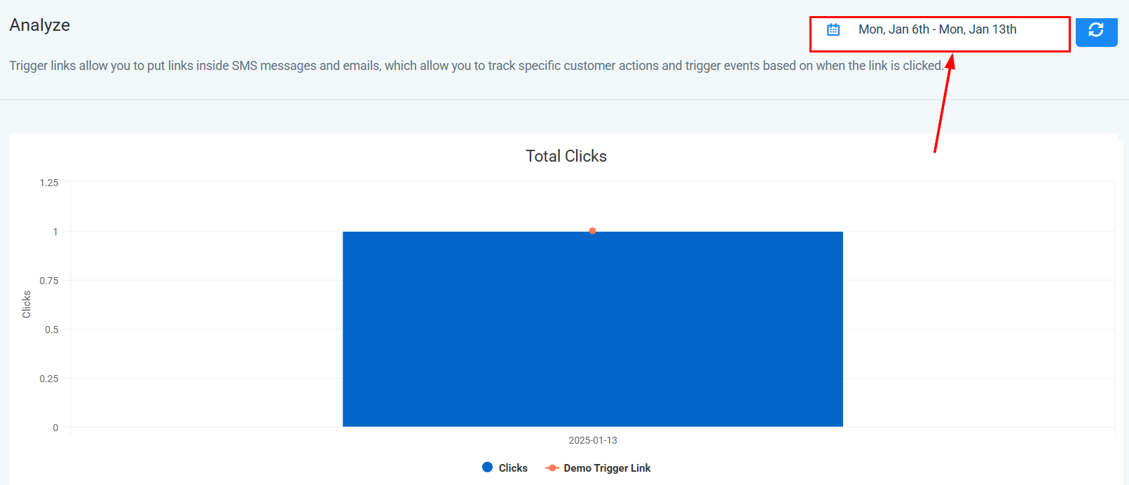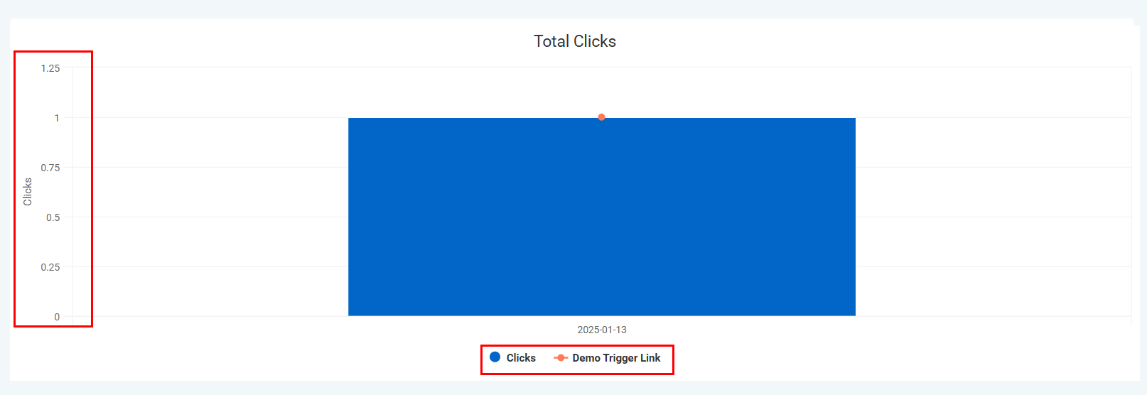 Hover over any bar in the chart to view additional details. This will display the total number of clicks associated with the trigger link during the specific period, saving you valuable time.