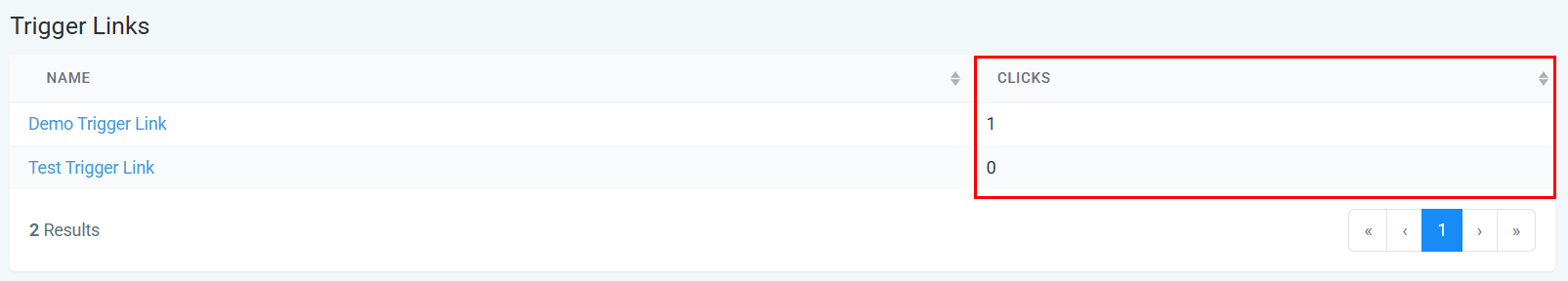 The right column shows the total number of clicks for each trigger link.