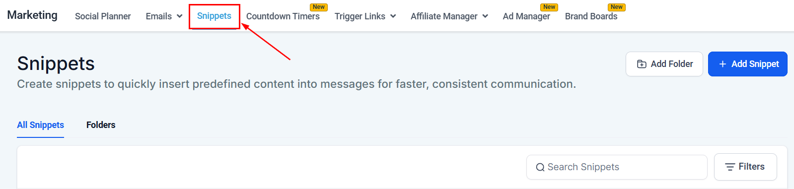 The Snippets section under the Marketing tab allows you to craft text messages and email templates, streamlining your team's ability to rapidly address common inquiries regarding your products or services. It is important to note that templates remain uniform across the entire CRM, and you can modify them in both Email Marketing and Conversations sections.