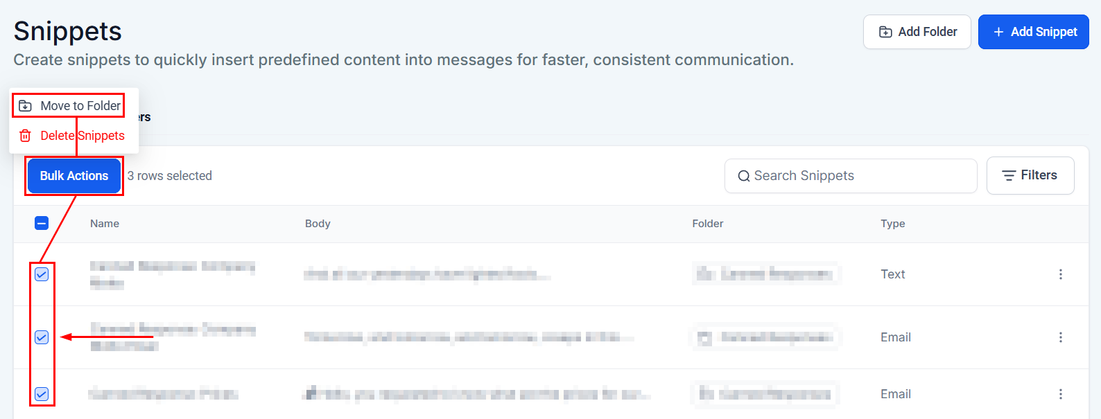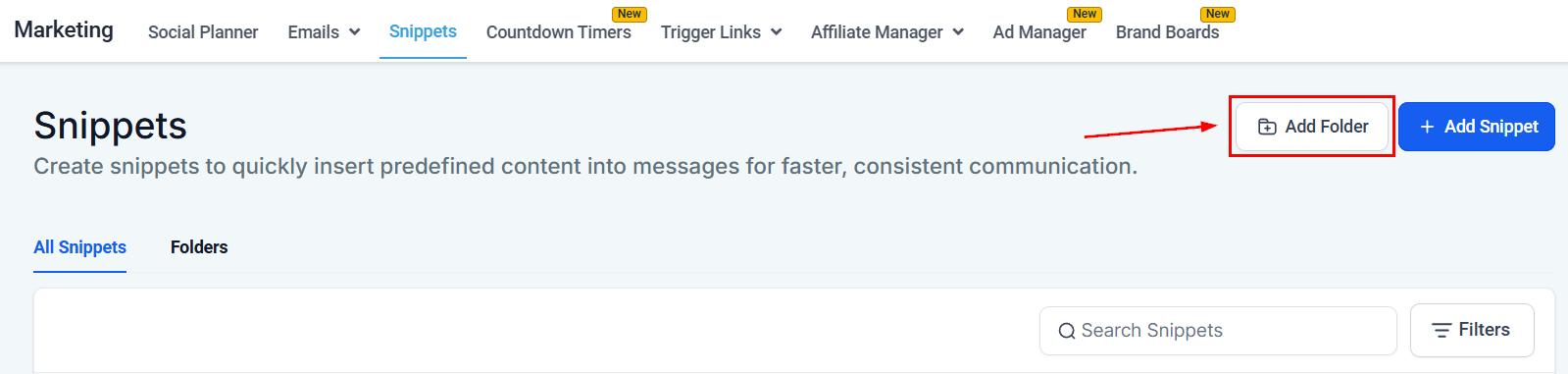 Folders allow you to organize the snippets into groups, to create them click +Add Folder.