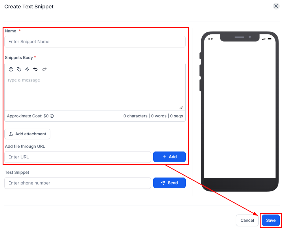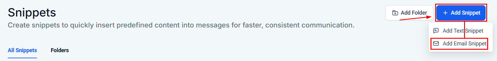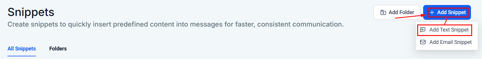 These snippets allow you to send and respond to SMS, Facebook DMs, Instagram DMs, and short chat messages in general. To create them click +Add Snippet and select Add Text Snippet.