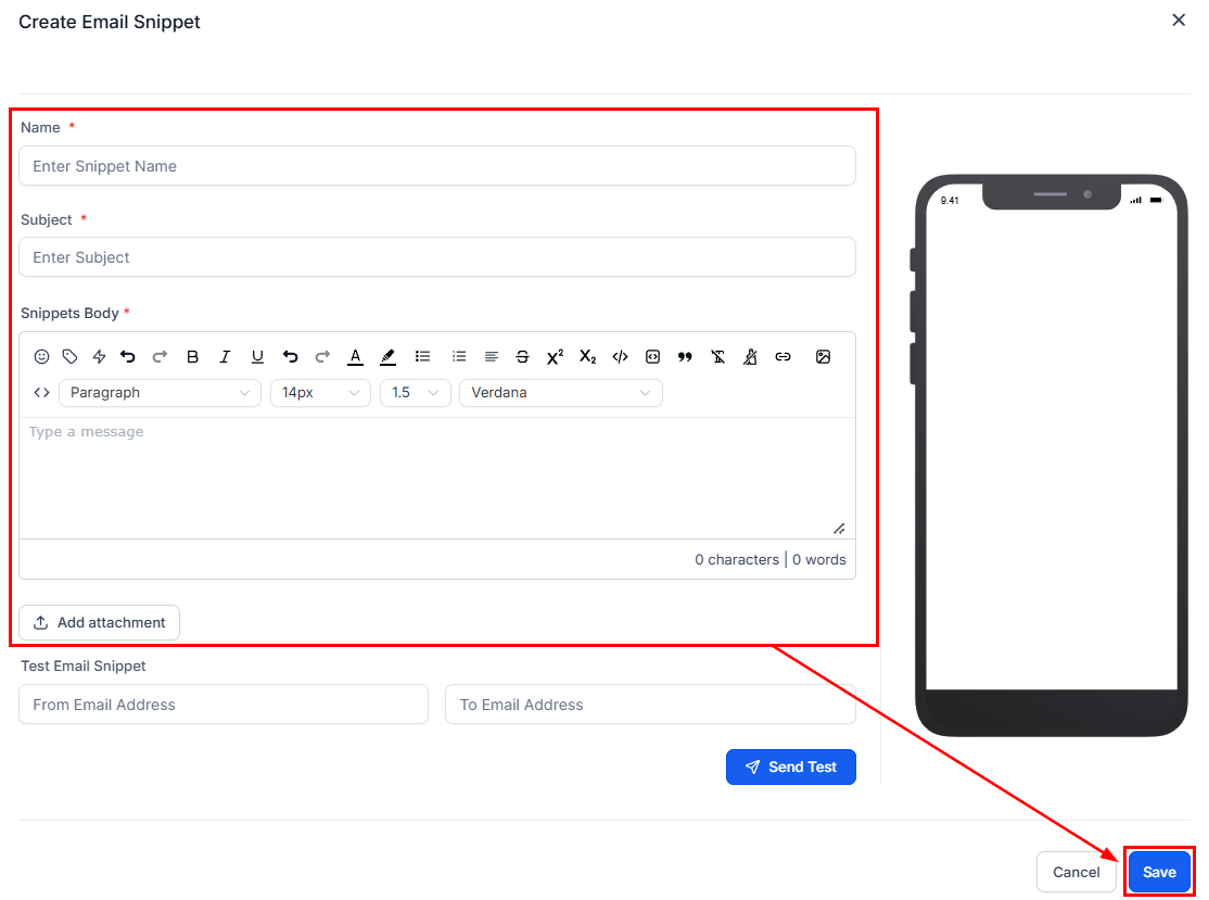 These will be simple email templates, unlike the ones used for email campaigns, they are meant for quick responses for things like a refund confirmation that don't need many media elements. To create them click +Add Snippet and select Add Email Snippet.