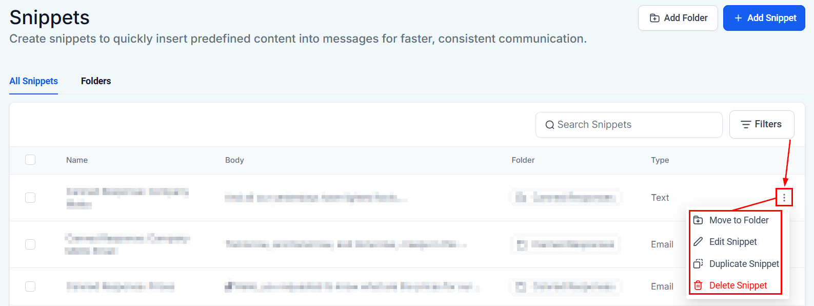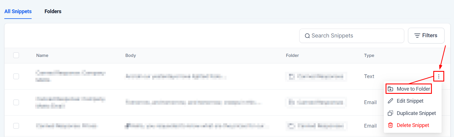 Once a snippet has been created you can click the three dots icon next to it to move, edit, duplicate, or delete the template.