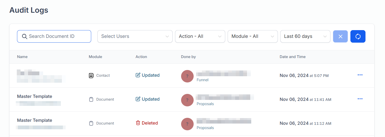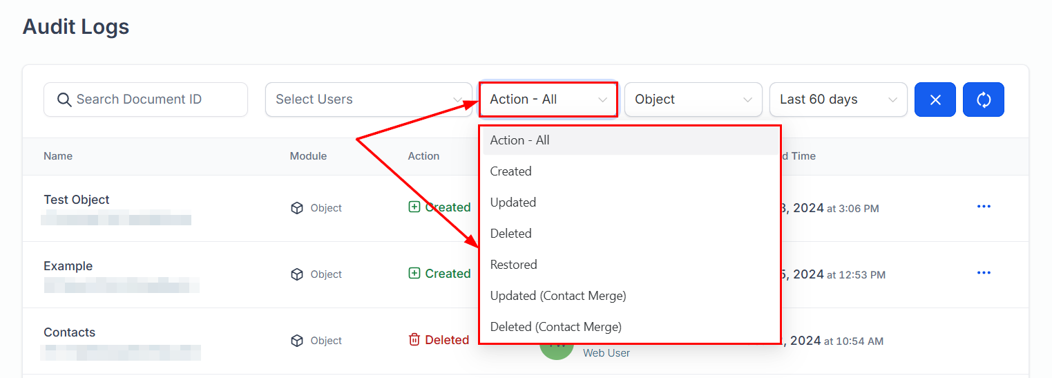 Refine the logs by selecting Created, Updated, or Deleted from the Actions filter.
