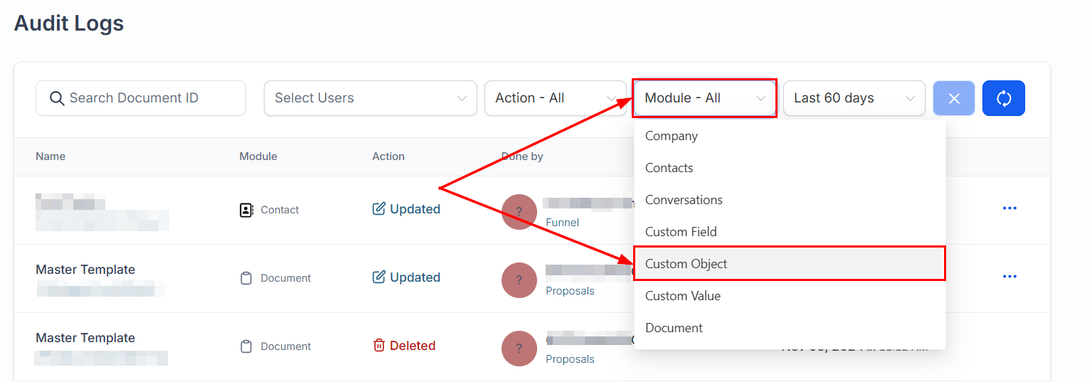 In this section, you can filter the Module by Associations, Custom Objects, or Objects, to find the specific logs you're interested in.