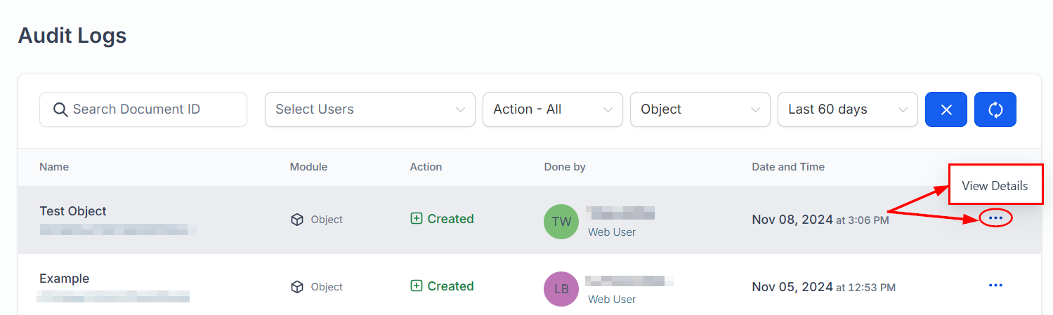 For more insights on any logged action, click on the three dots (ellipsis) to the right of a record and select "View Details" to access comprehensive information.