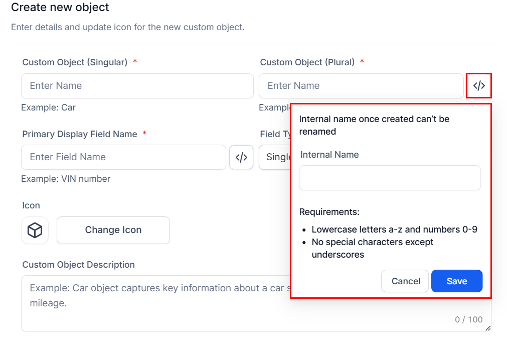 Optionally, set an internal name for your object by clicking the icon next to the Plural Object Name field. Once this name has been saved, it cannot be renamed.