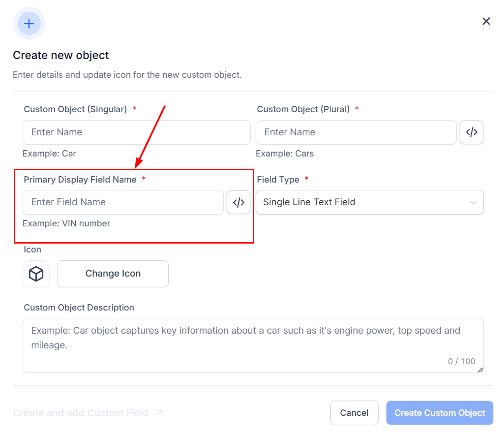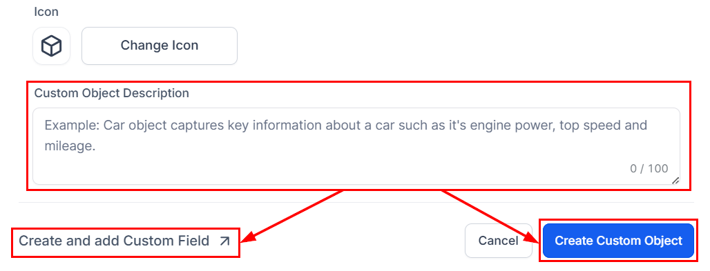Finally, enter a description of the object in the Description field. Then, choose whether to save the object without adding custom fields or to create custom fields along with the object.