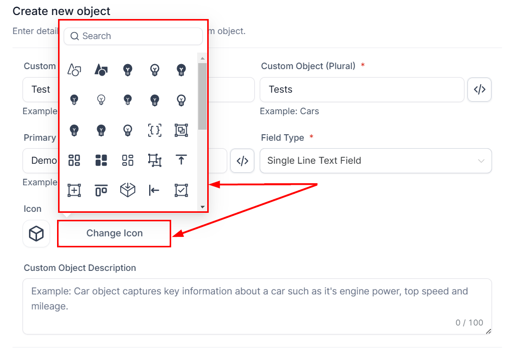 Select an icon to represent your object, utilizing the search bar to locate a specific icon suited to your preferences.