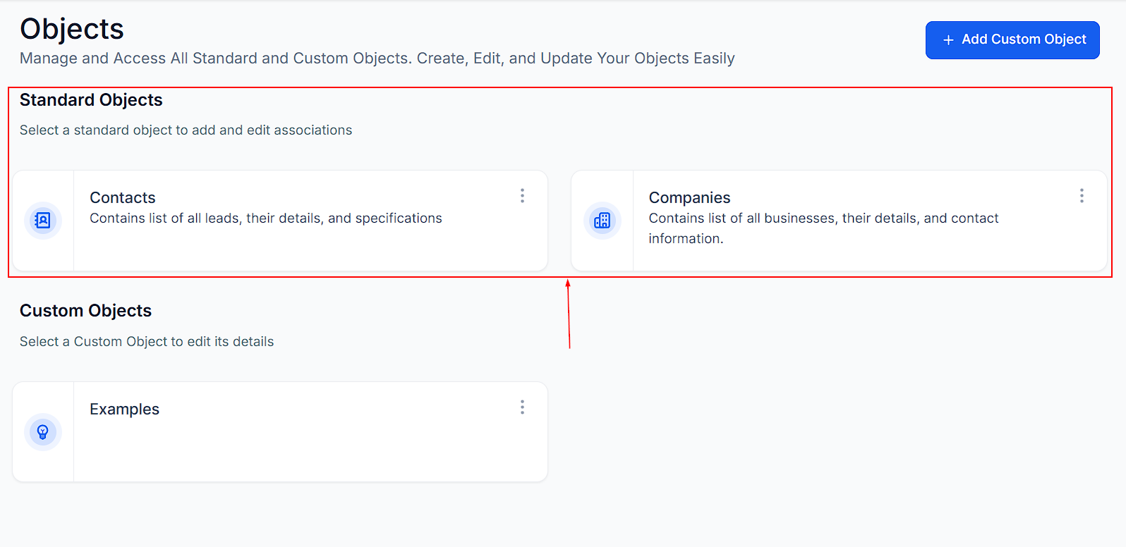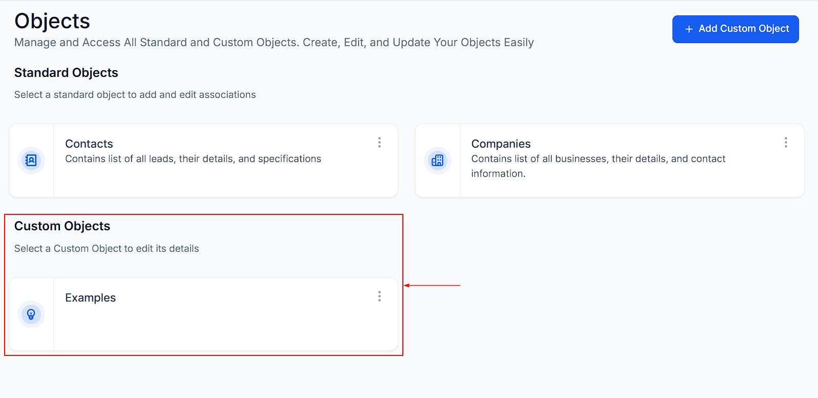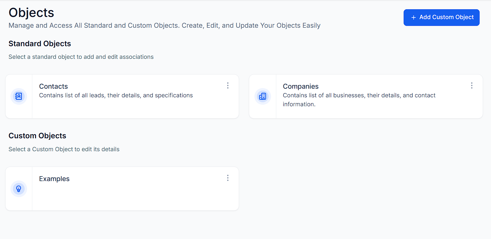 Objects enable users to organize, filter, and visualize information according to their operational needs, greatly enhancing data management and offering a more customized and efficient way to handle intricate data. The Objects section in your account allows you to access and manage all Standard and Custom Objects efficiently.