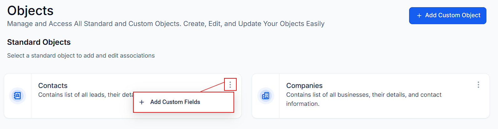 To add custom fields to a Standard Object, click the three-dot menu next to the object, then configure the custom field according to your preferences.
