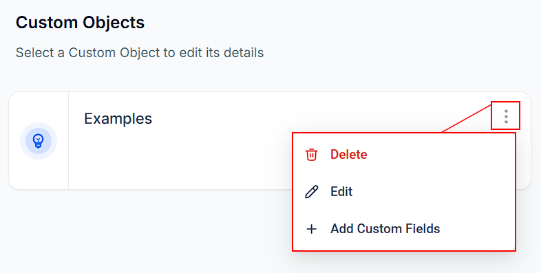 Edit, delete, or add custom fields to the custom object by choosing the relevant option from the actions menu.