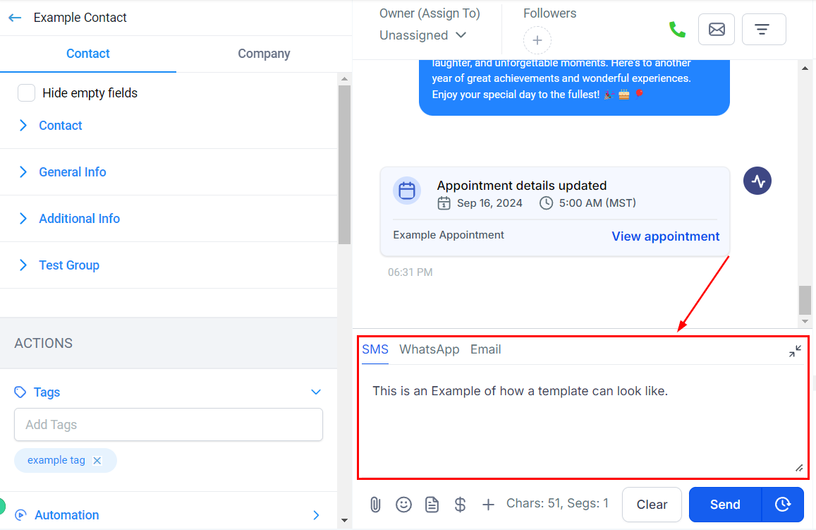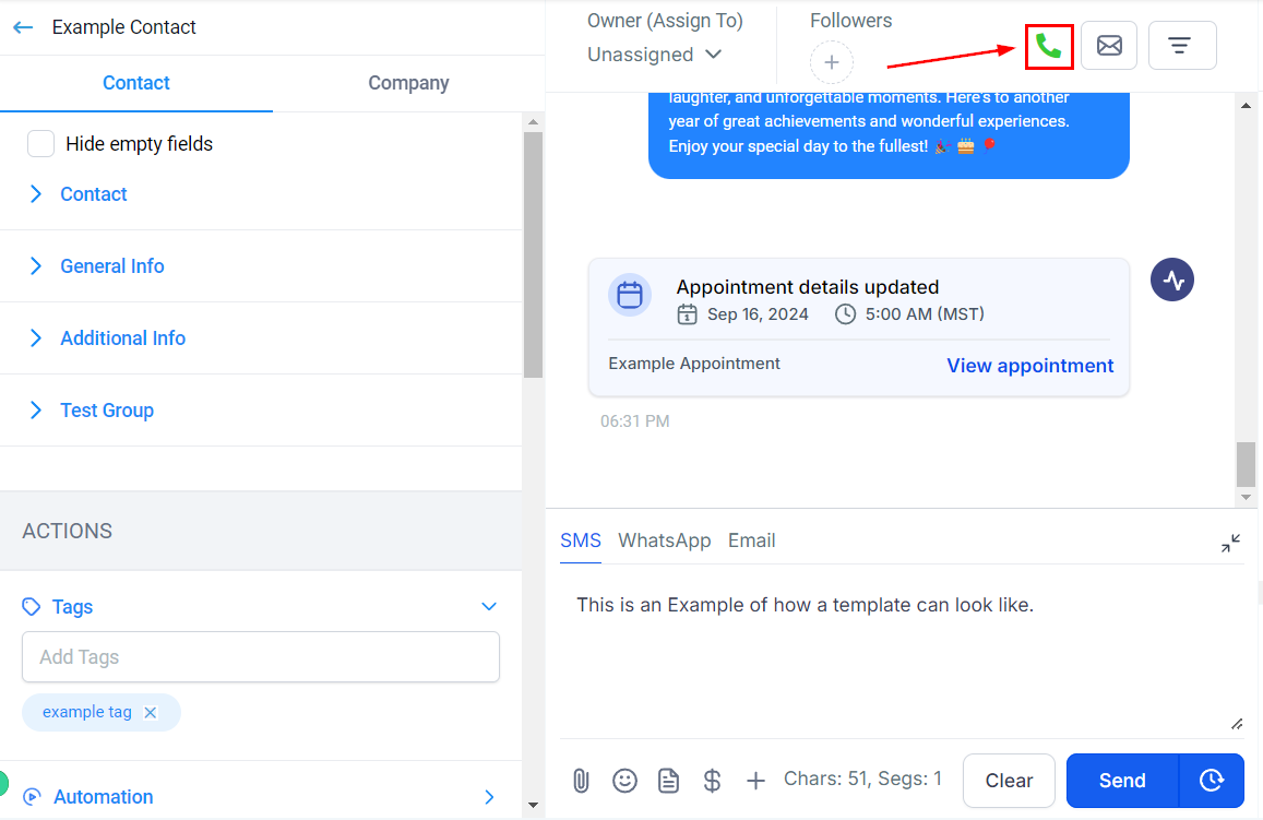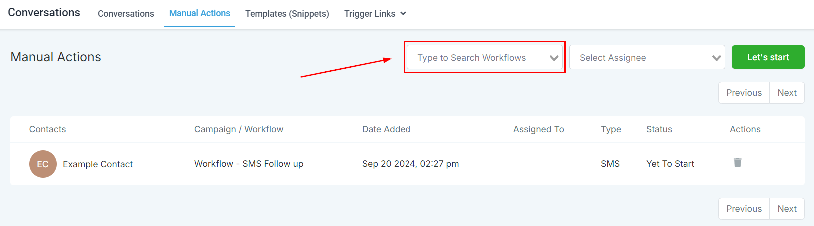 Keep all your team’s manual actions, such as phone calls and SMS messages, organized within this section. This is a great way to keep your team on top of SMS messages and phone calls you don’t want to be automated. To start with Manual Actions, open the Conversation tab in your CRM, then click on Manual Actions at the top of the page.