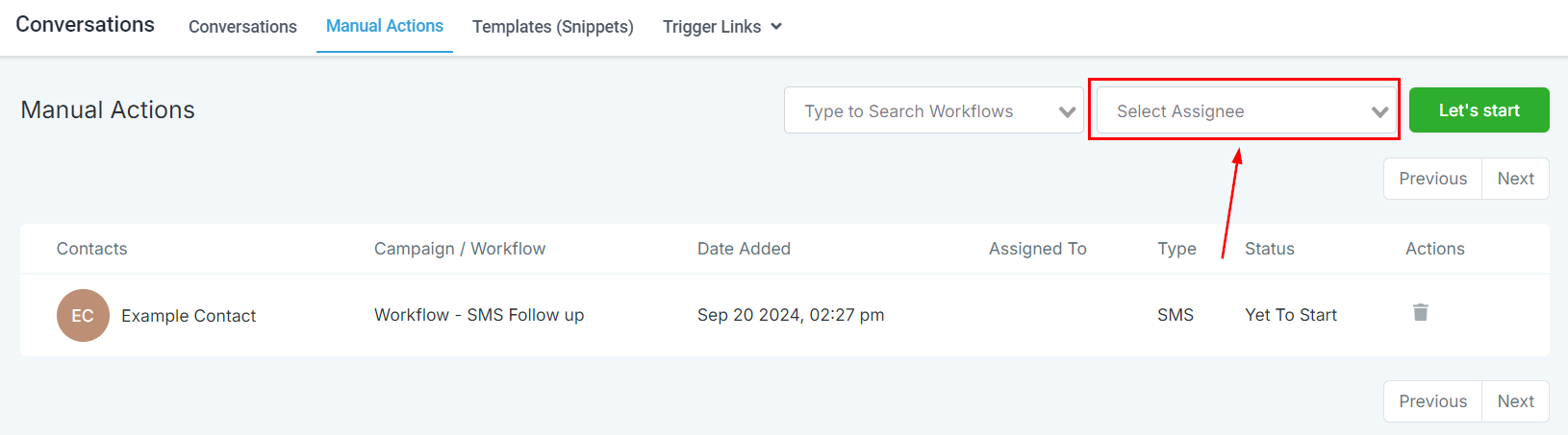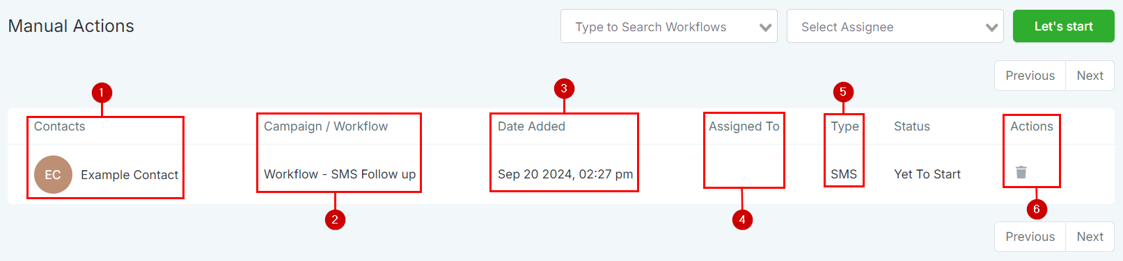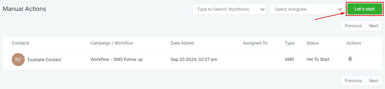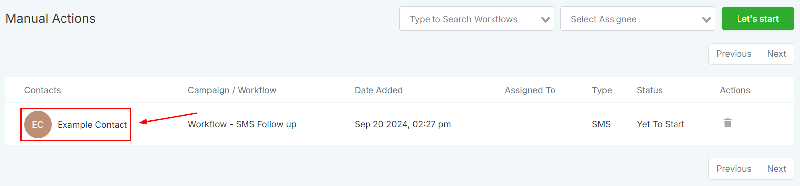 To initiate a manual action, click the Let's Start button. This will guide you to the detailed information of the first contact in your list, where you can manually place a call or send an SMS/Email.