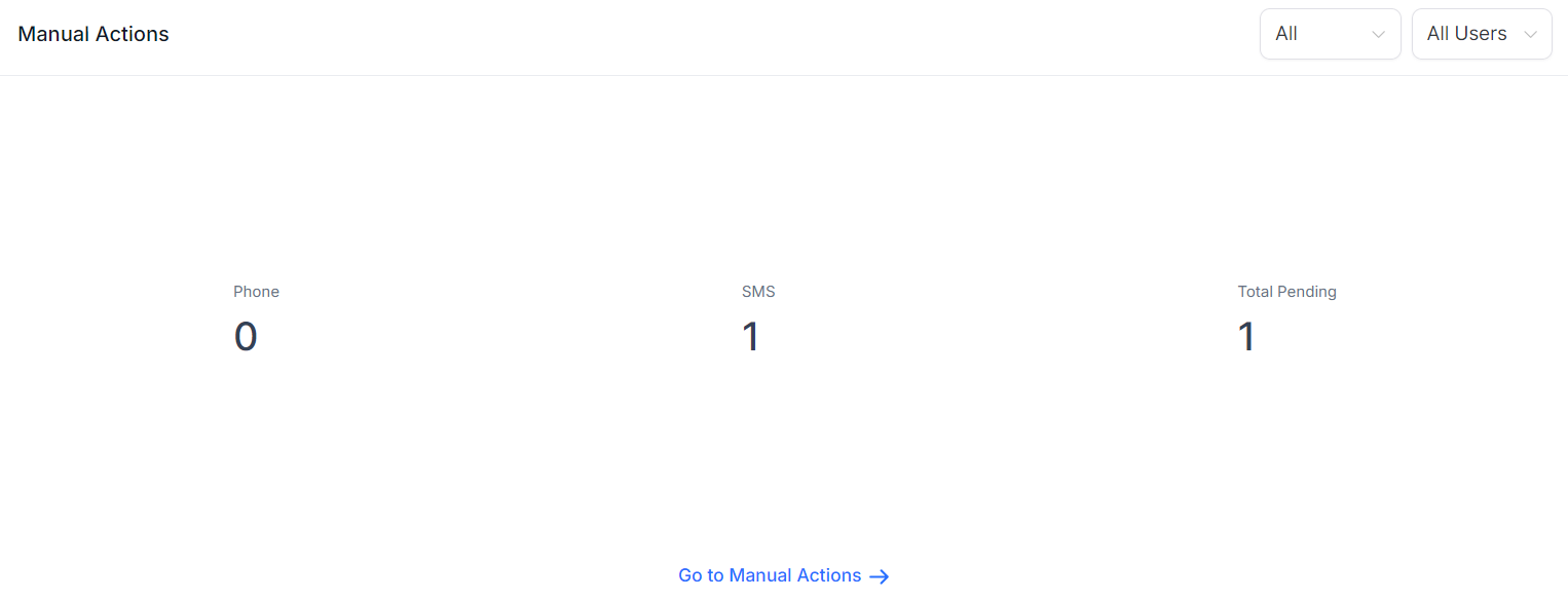 Your CRM dashboard can help you stay organized and up-to-date with your manual actions. Easily view what tasks need to be completed, and the number pending in a clear visual representation. Here you can view the total number of manual actions pending and a separate view of the total number of phone calls and SMS messages.