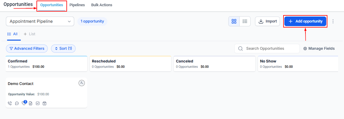 To commence the creation of a new opportunity, head to the "Opportunities" section from your account Dashboard, then click the “+ Add Opportunity” button.