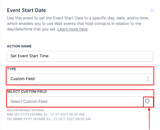 When using the Custom Field option, users can select a custom value or contact that will serve as the Event Start Date. By clicking on the tag icon, users can also select a custom field that is either in date or text type fields from the Select Custom Fields option.