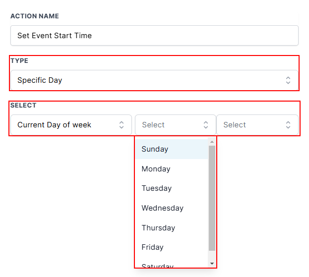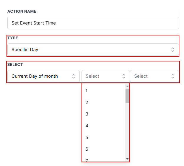The Action Type provides different options and use cases within the Event Start Date. Here you can select from a Custom field, a Specific date/time, or a Specific day.