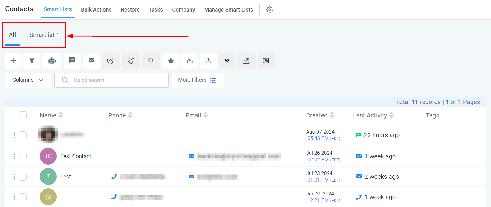 After you have created and saved your new list, it will show up in the top row to make it easier for you to locate. By creating and saving your new smart list within this section, it remains available for future use.