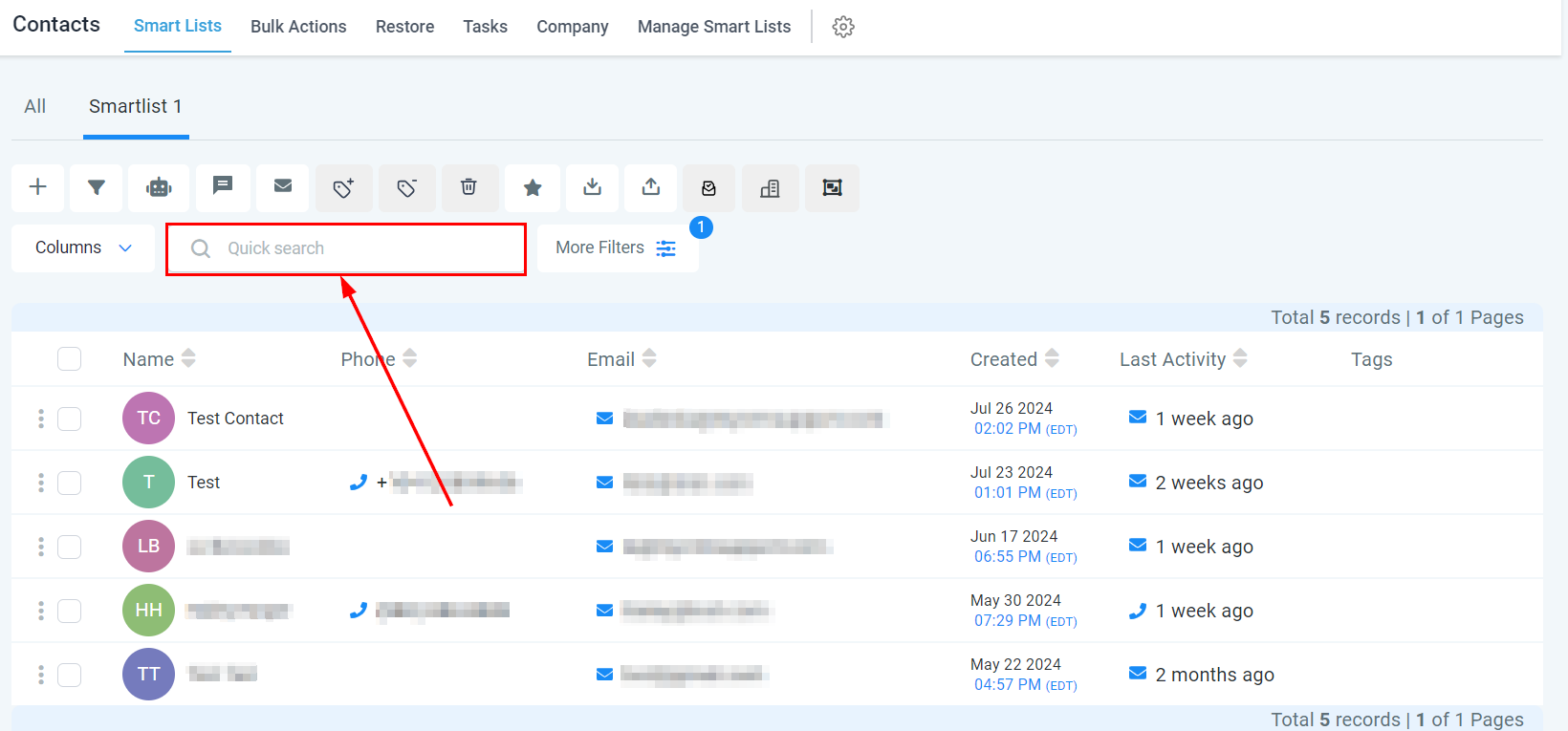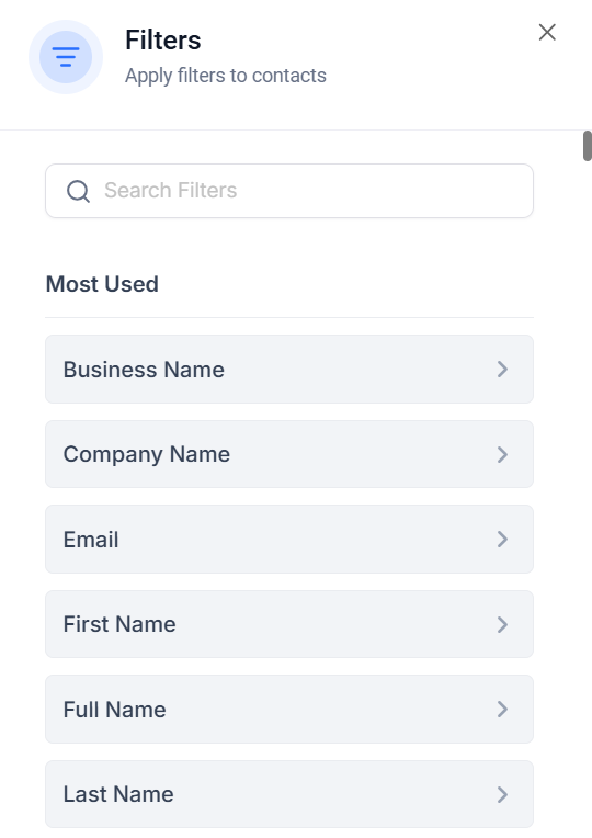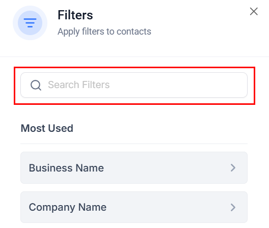 Utilize the search bar on the top right to search using contact name, business name, tags, email, or phone number by entering a minimum of 3 digits/characters.