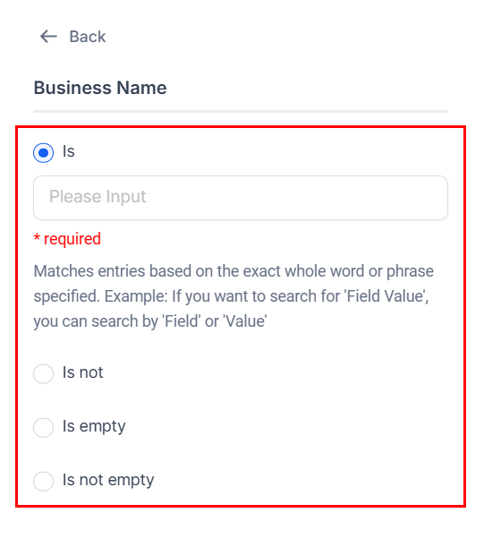 After selecting a filter from the list, define the conditions that contacts must meet to be included in the smart list. Filters such as “Is,” “Is Not,” “More Than,” “Less Than,” and “Contains” require specific input values. Meanwhile, options like “Is Empty,” “Is Not Empty,” and “Has Active Campaign” are designed to simply verify the presence or absence of the specified criteria.
