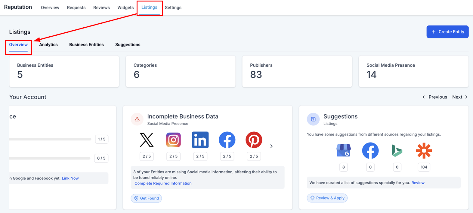The Listings Overview is a critical tool for evaluating how your business performs across major social media platforms like Facebook, Instagram, and X (formerly Twitter). By providing a centralized snapshot of your online visibility, it allows you to monitor key metrics and identify areas for improvement. Efficiently managing your listing information ensures accuracy and boosts your credibility and discoverability online. Continue reading to learn about the Listings Overview section of your account.