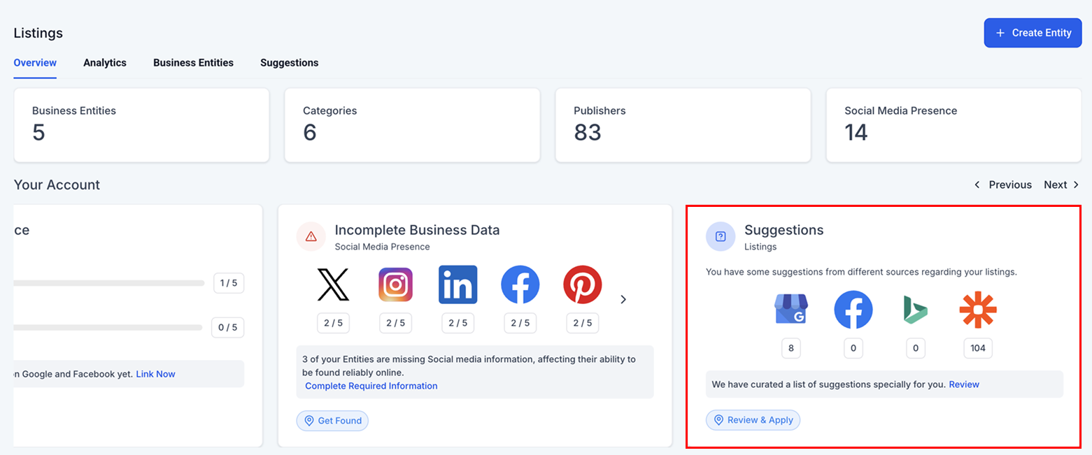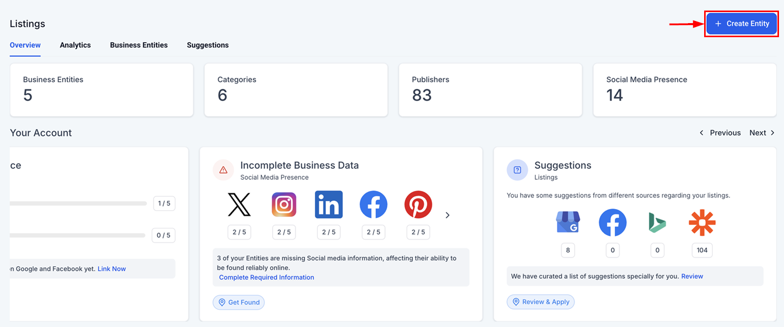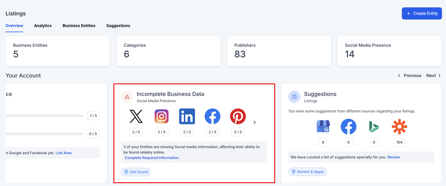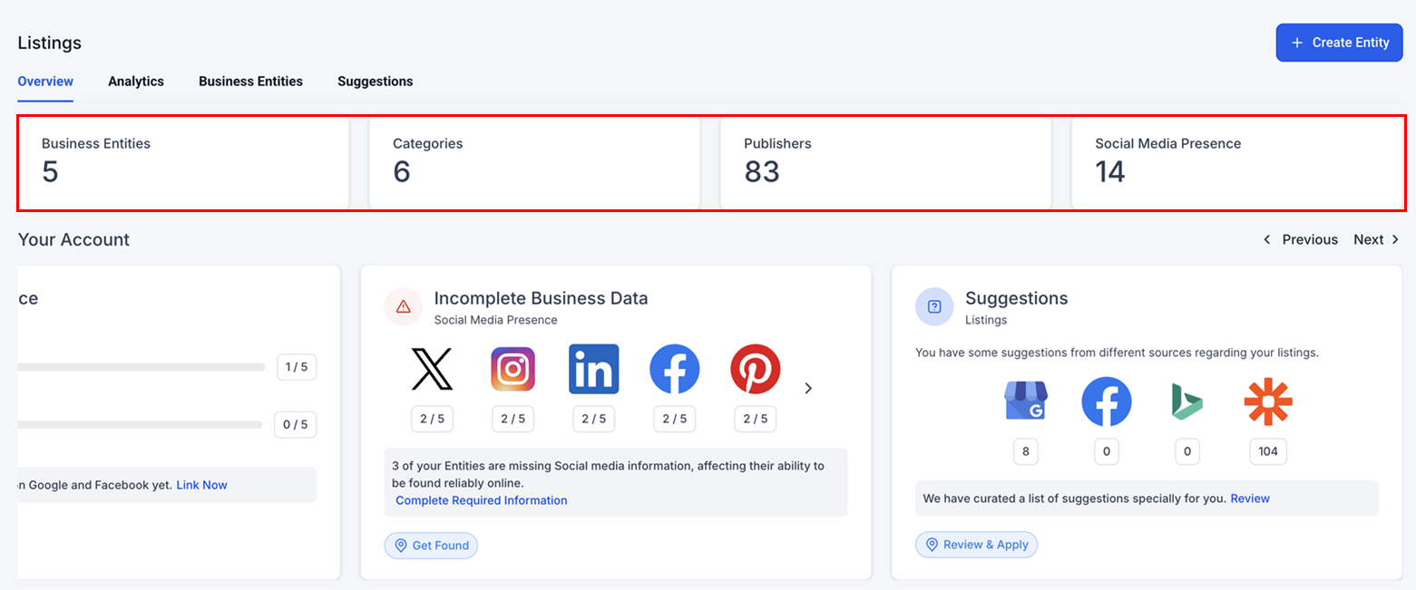 After adding entities, the dashboard will display a comprehensive summary including the total number of entities, their assigned categories, and the associated publishers. In addition, it will highlight the number of social media platforms where your listings have been identified, giving you a clear overview of your digital footprint.