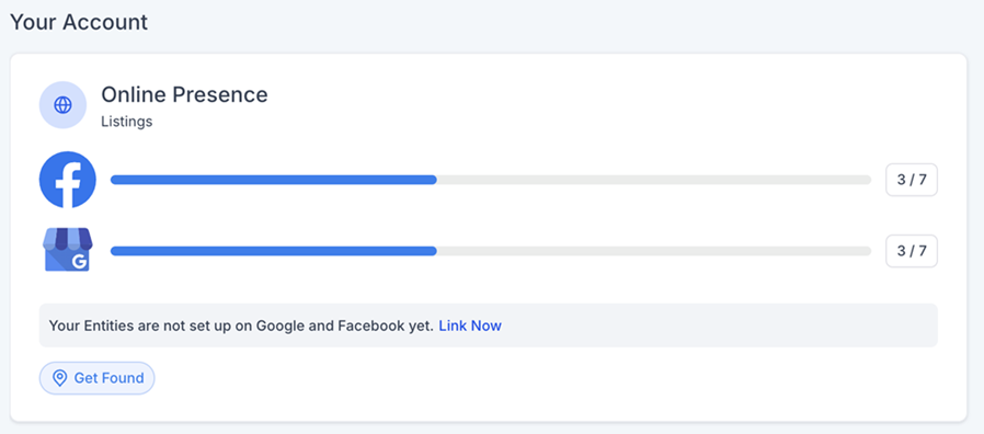 In the “Your Account” section, you’ll first encounter the Online Presence widget. This tool is designed to spotlight social media platforms that haven’t been fully configured for your entities, making it easy to identify any gaps in your online presence. It also provides a convenient option to link and configure these platforms directly, ensuring a more complete digital profile.