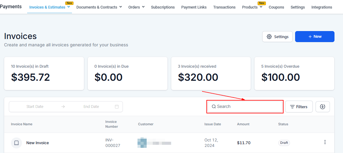 To further refine your search, use the search bar to find specific invoices by entering details such as the invoice number, invoice name, or customer name.