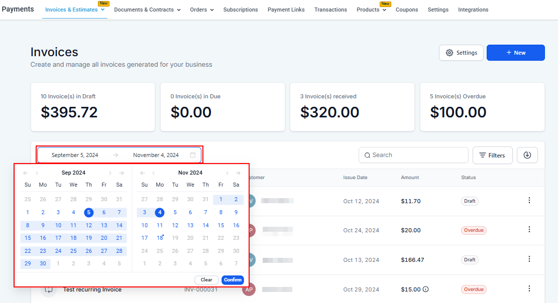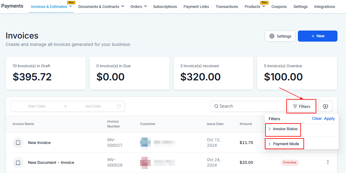 Additionally, you can filter invoices based on their status, such as All, Draft, Sent, Overdue, or Paid. This allows you to quickly review and manage invoices in different stages of the payment process.