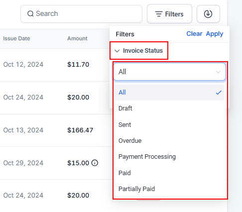 Filters allow you to quickly narrow down your invoice list to find exactly what you need. Here’s how to use them: