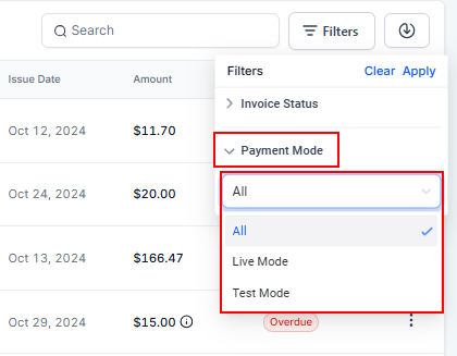 You can also filter invoices by payment mode, choosing between Live or Test mode.
