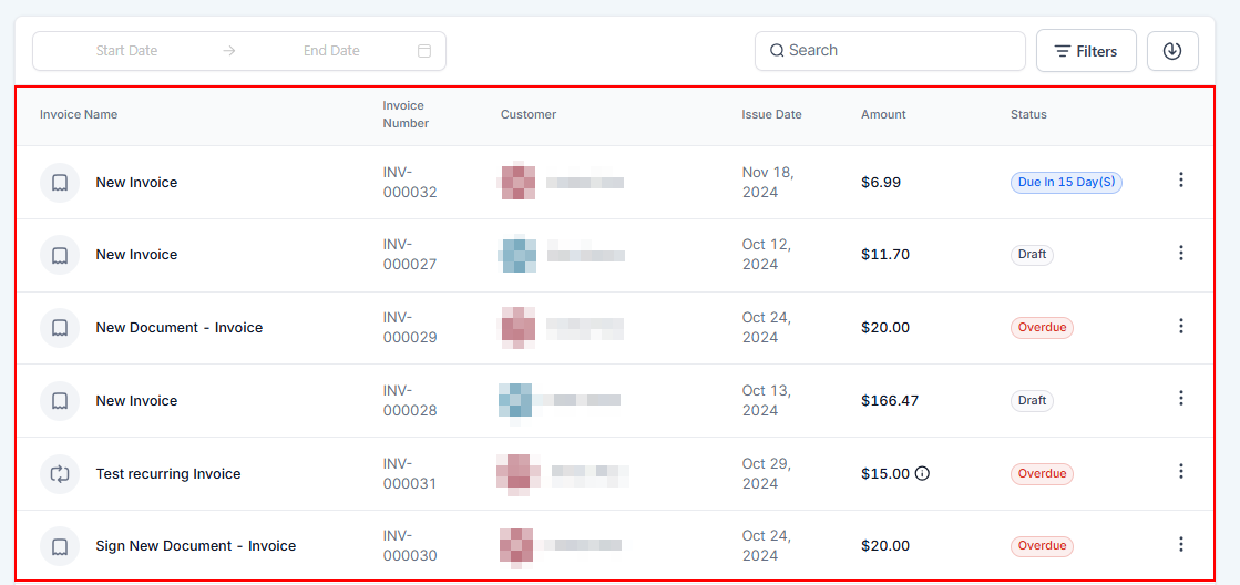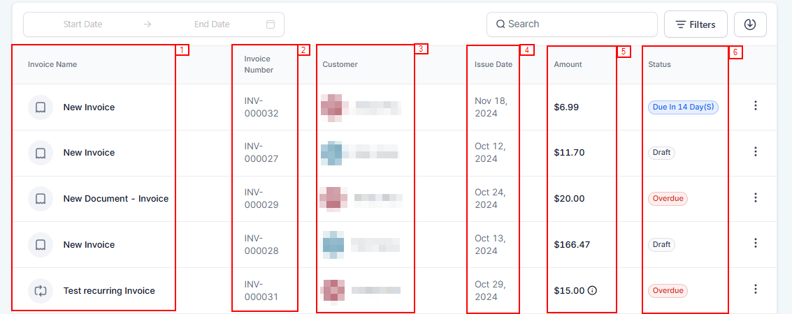 - Status: Shows the status of each invoice in the list; Overdue, Paid, Draft, etc.