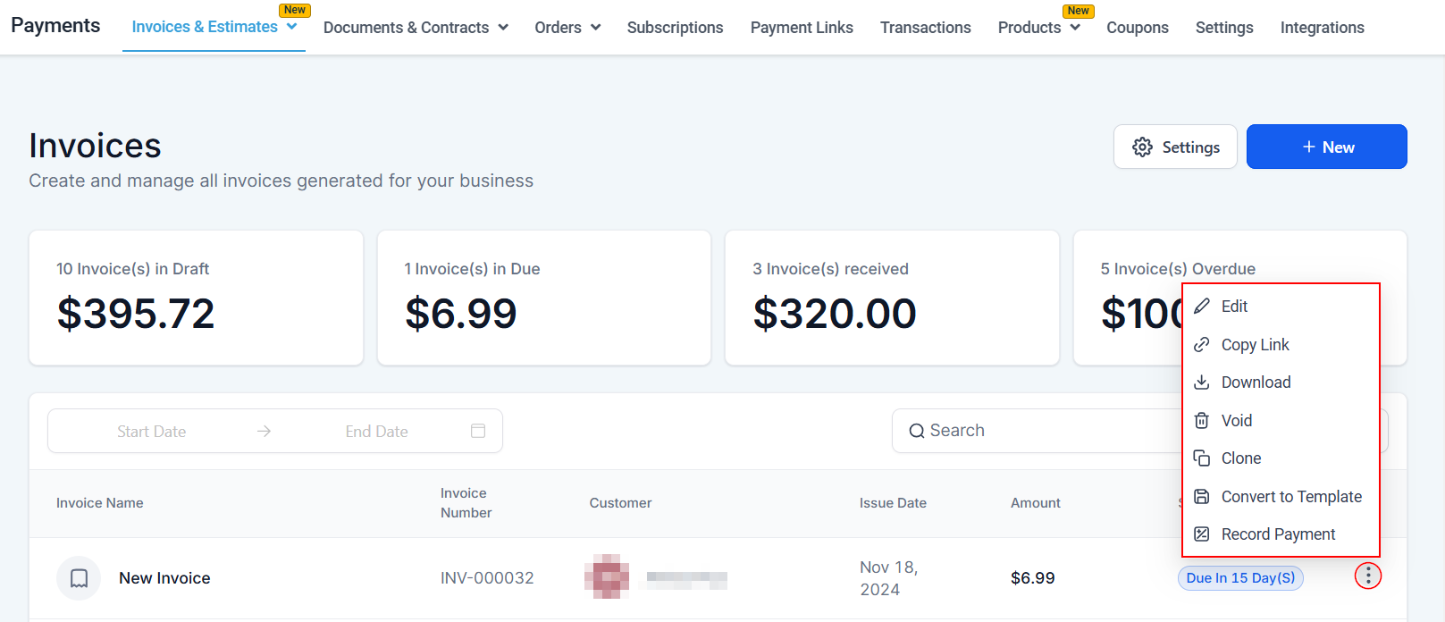 On the right side of your preferred invoice, click on the three-dotted button to reveal a dropdown menu containing: