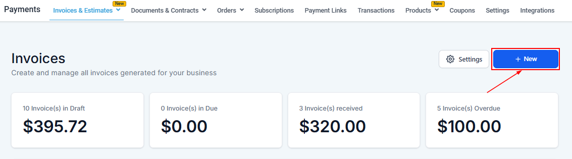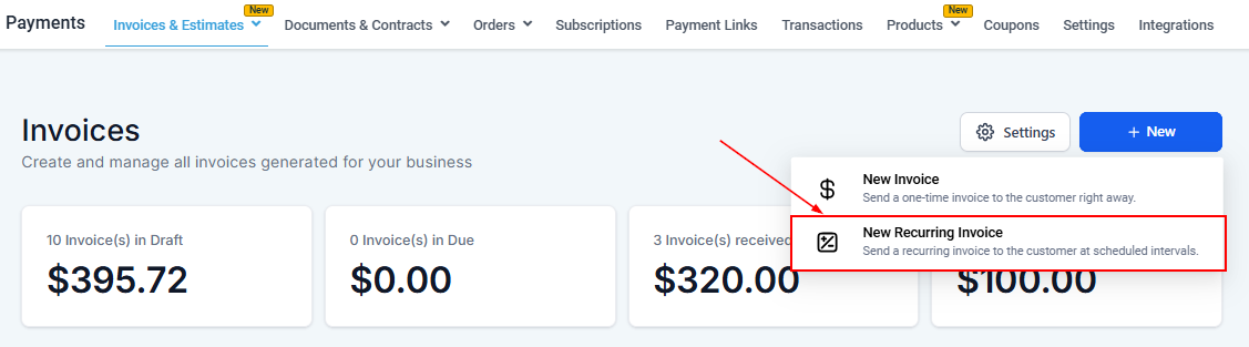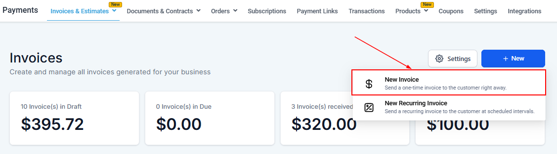 To create a one-time Invoice click on the +New button and then click New Invoice.