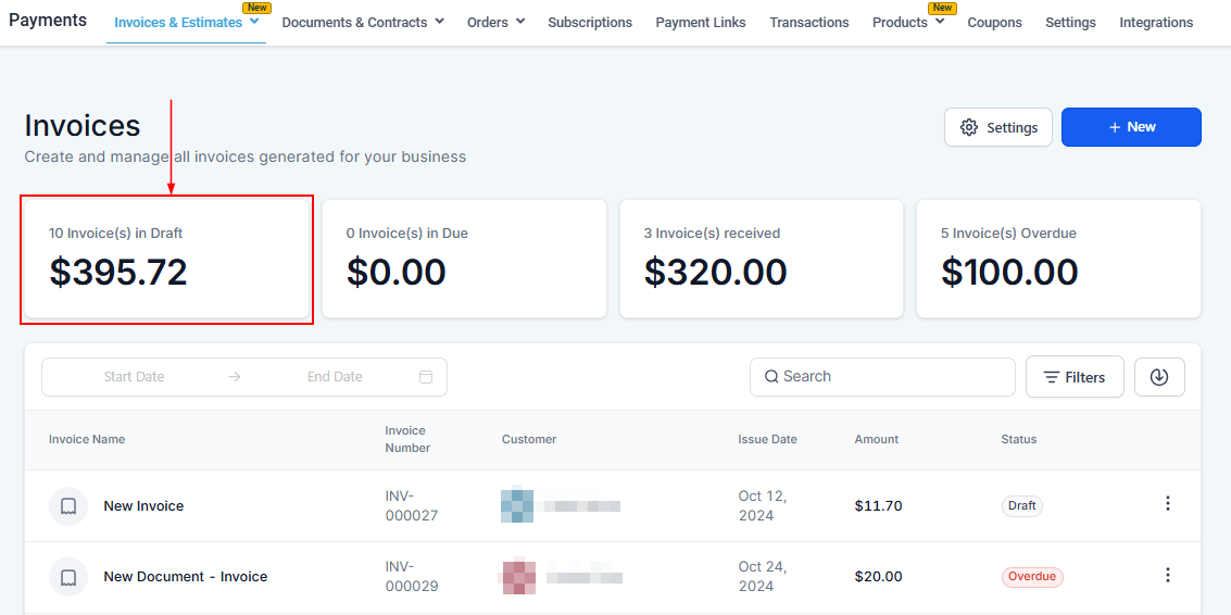 You can conveniently view the count of invoices currently in draft mode, as well as the cumulative sum generated from these invoices, in the designated section.
