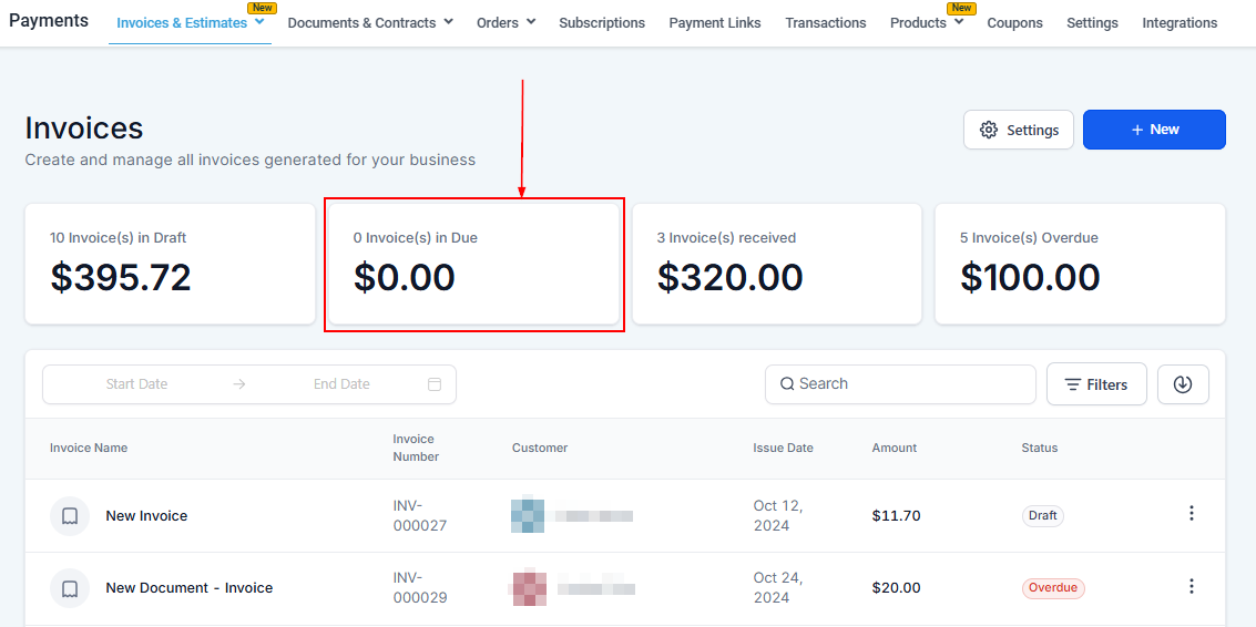 - All: When selected, this option will show all of the invoices you have created in your CRM location.